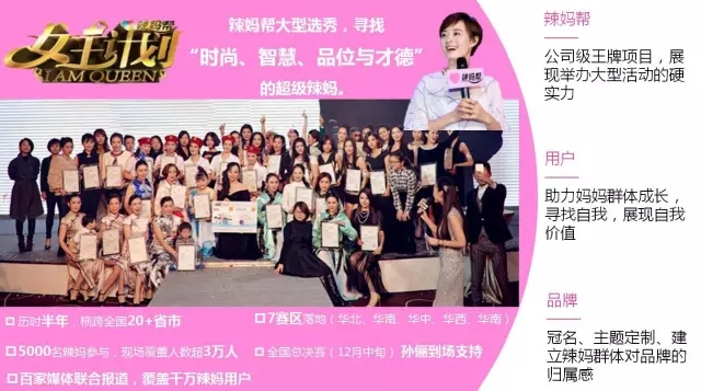 辣媽幫自2015年起與全國婦聯(lián)展開了為期五年的獨家合作,希望通過此舉打通全國醫(yī)務(wù)渠道,尋找到源頭用戶,將孕媽媽人群培養(yǎng)成為孕期伴侶、辣媽幫用戶,并通過社區(qū)固定用戶行為,利用辣媽商城、荷花親子將其有效轉(zhuǎn)化為購買人群。辣媽幫與全國婦聯(lián)的深度合作,每年將影響到1500多萬的孕媽媽,而這其中500多萬人會被轉(zhuǎn)化為辣媽幫用戶。