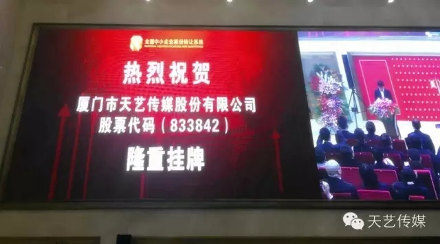 廈門(mén)市天藝傳媒股份有限公司于2015年11月13日在北京股轉(zhuǎn)公司舉行新三板掛牌敲鐘儀式。